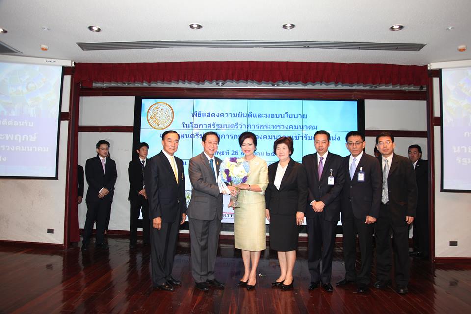 26 สิงหาคม 2556 คุณสาริณี แสงประสิทธิ์ กรรมการผู้อำนวยการใหญ่ พร้อมด้วย ผู้บริหารระดับสูงของวิทยุการบินฯ เข้าร่วมแสดงความยินดีในโอกาสที่คุณอาคม เติมพิทยาไพสิฐ เข้ารับตำแหน่งรัฐมนตรีว่าการกระทรวงคมนาคม และคุณออมสิน ชีวะพฤกษ์ เข้ารับตำแหน่งรัฐมนตรีช่วยว่าการกระทรวงคมนาคม พร้อมมอบนโยบายและแนวทางการทำงานของกระทรวงคมนาคมให้กับหน่วยงานในสังกัด ณ ห้องประชุม อาคารสโมสร กระทรวงคมนาคม โดยท่าน รวค. ได้มอบนโยบายที่จะมุ่งเน้นการ Deliver โครงการระยะสั้นให้ออกสู่สาธารณะ ใน 5 ด้าน 1. ขับเคลื่อนผลักดันโครงการการลงทุนด้านโครงสร้างพื้นฐานการคมนาคมขนส่งทั้งทางบก/น้ำ/ราง/อากาศระยะสั้น 58-59 มี 17 โครงการ วงเงินงบประมาณ 1.6 ล้านล้านบาท โดยจะเร่งรัดการเบิกจ่ายงบประมาณโครงการ และงบกระตุ้นเศรษกิจ ตามนโยบายของรัฐบาล 2. การใช้ประโยชน์จากการบริการระบบคมนาคมขนส่ง คค. โดยเชื่อมโยงโครงสร้างพื้นฐานกับการท่องเที่ยว เศรษฐกิจและสุขภาพของประชาชน เช่น การจัดทำทางจักรยาน 3. การปรับปรุงระบบการขนส่งสาธารณะ เพื่อเพิ่มคุณภาพและประสิทธิภาพการให้บริการ คค. ลดต้นทุน/ลดการอุดหนุนจากรัฐบาล 4. การแก้ปัญหาและสร้างมาตรฐานใหม่ เช่น กรณีการแยกหน่วยงานปฏิบัติออกจากหน่วยที่กำกับดูแล ทั้งด้านทางน้ำ ทางอากาศ และทางราง 5. ดำเนินการตามแผนฟื้นฟูรัฐวิสาหกิจ ที่อยู่ในกำกับดูแลของ Super Board ทั้งนี้มุ่งเน้นให้ทุกหน่วยงานในสังกัดกระทรวงคมนาคมบริหารงานด้วยความโปรงใส่เป็นสำคัญ