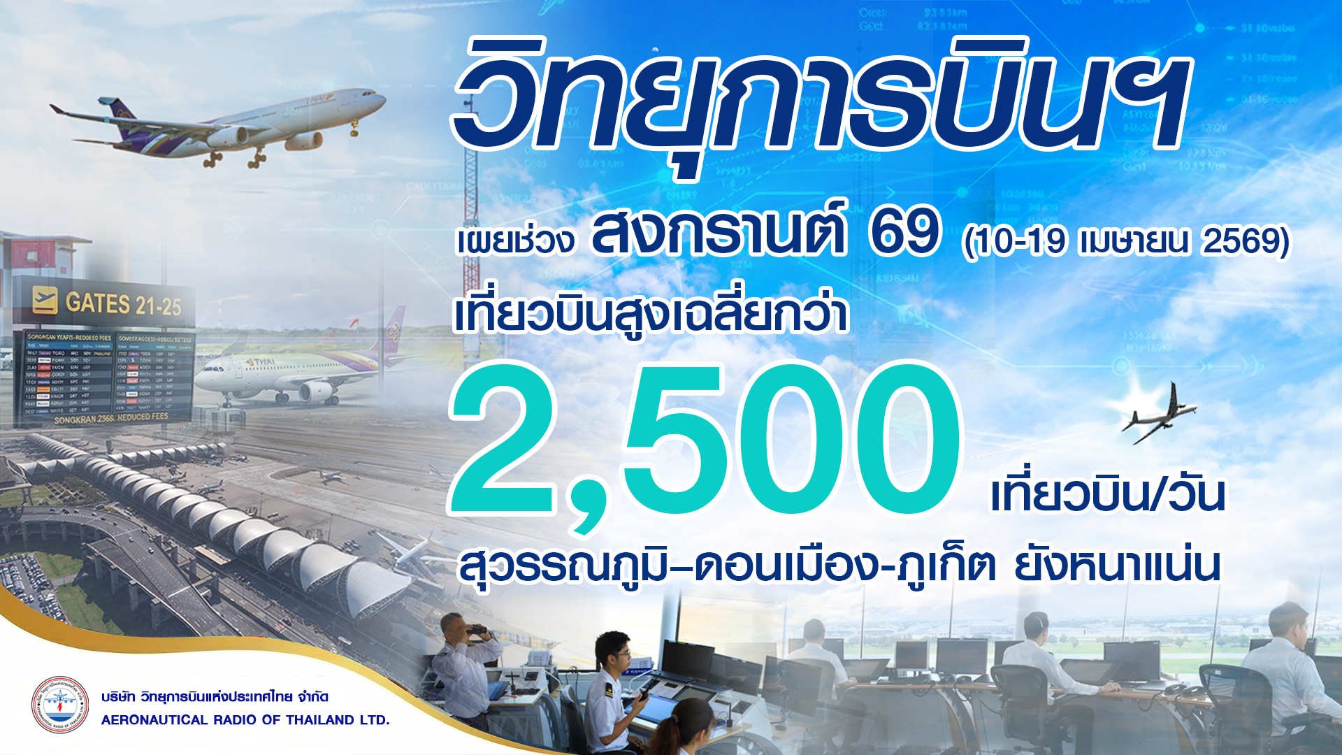 วิทยุการบินฯ เผยช่วงสงกรานต์ 69 เที่ยวบินสูงเฉลี่ยกว่า 2,500 เที่ยวบิน/วัน สุวรรณภูมิ–ดอนเมือง-ภูเก็ต ยังหนาแน่น